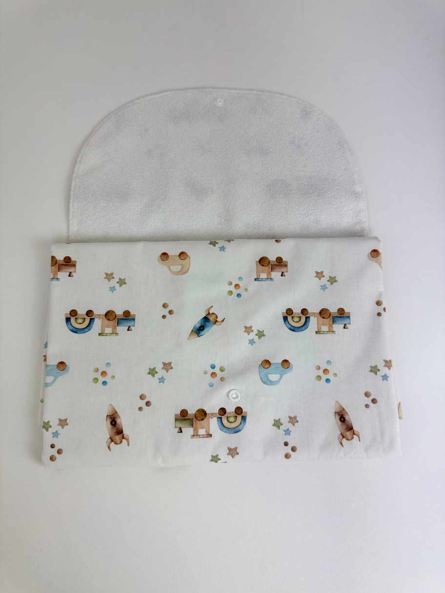 Un indispensable para el cuidado de tu bebé, este cambiador está confeccionado en tejido de algodón 100% y cuenta con una fina capa de rizo de toalla impermeable. Su diseño ligero permite que se pliegue y quepa en cualquier bolsa de paseo, siendo muy práctico para llevar a todos lados. Además, se puede dejar abierto en el cambiador, combinando perfectamente con la toalla de baño y el arrullo.